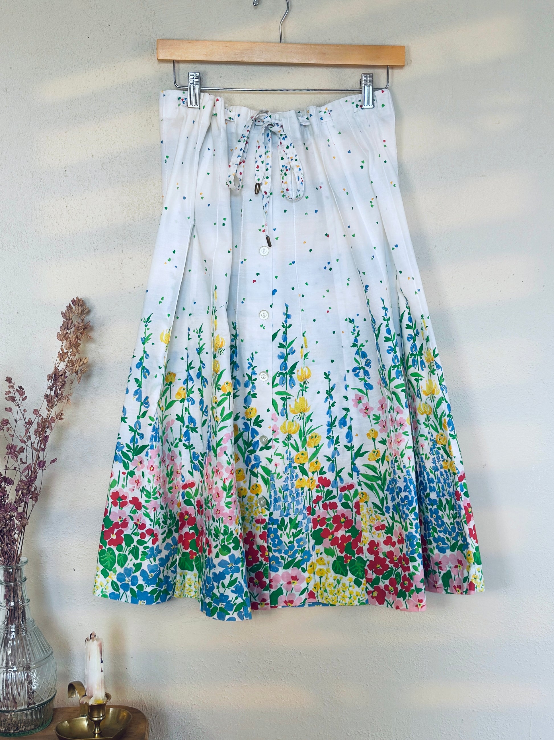 Sweet floral A-line midi skirt from the brand Tumbleweeds. Buttons down the middle and cinches at the waist to adjust the size.